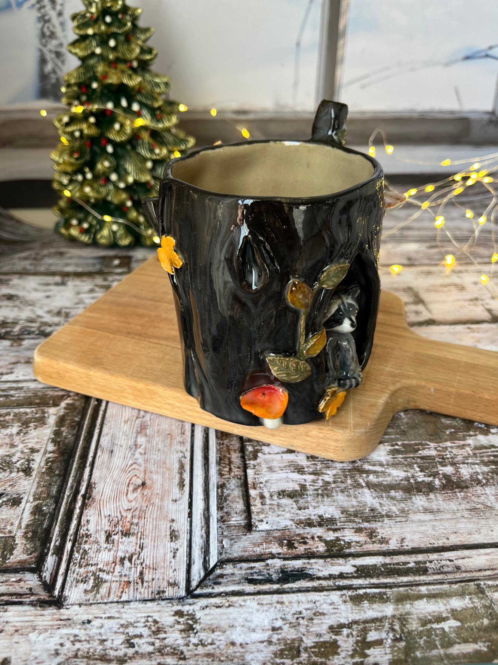 Plongez dans un univers forestier avec ce magnifique mug en céramique au design original, mettant en scène un adorable raton laveur en relief, niché dans le creux d’un tronc d’arbre. Chaque détail  les feuilles, champignons et textures boisées façonné et peint à la main apporte une atmosphère chaleureuse et féérique.