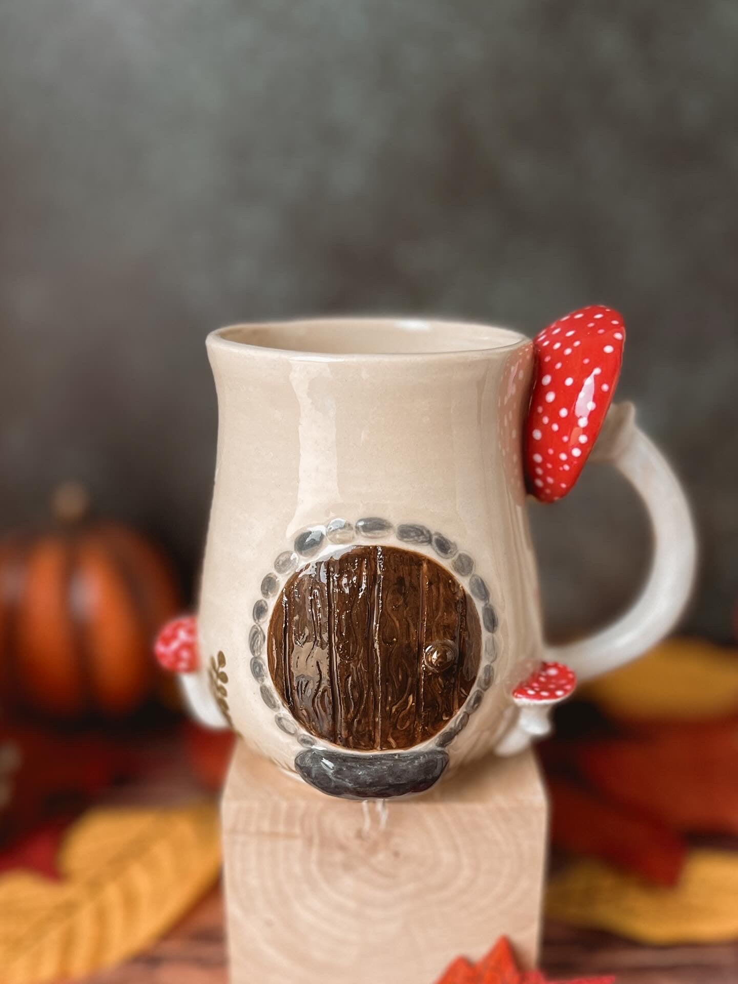 Cette tasse est entièrement peinte et réalisée à la main au tour de potier ainsi que toutes les petites fleurs et feuillages.